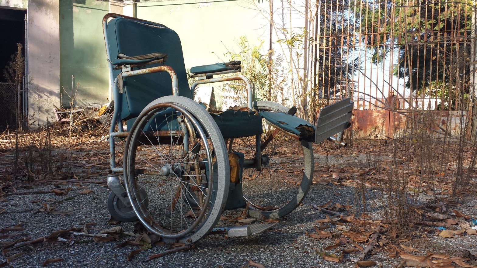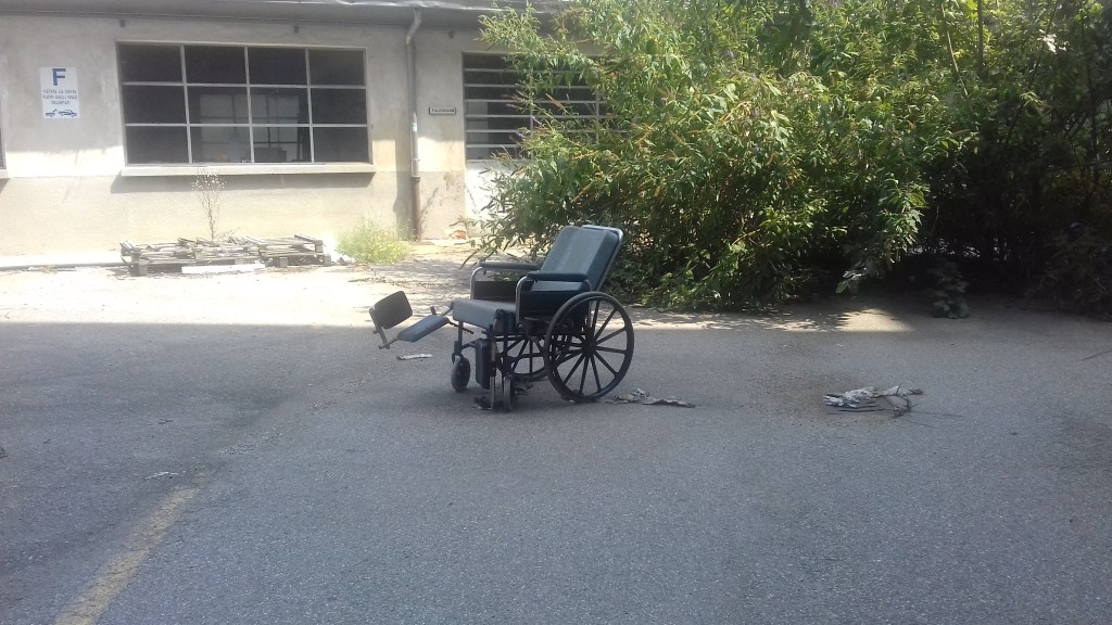In questa foto un delle sedie a rotelle abbandonate nel vecchio ospedale dell’Eremo di Lanzo (To)
