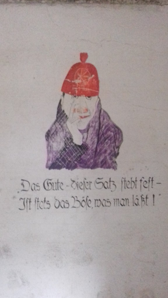 Una vignetta satirica disegnata dei soldati nazisti nell’ala adibita a dormitorio al primo piano sempre nel castello del Drosso