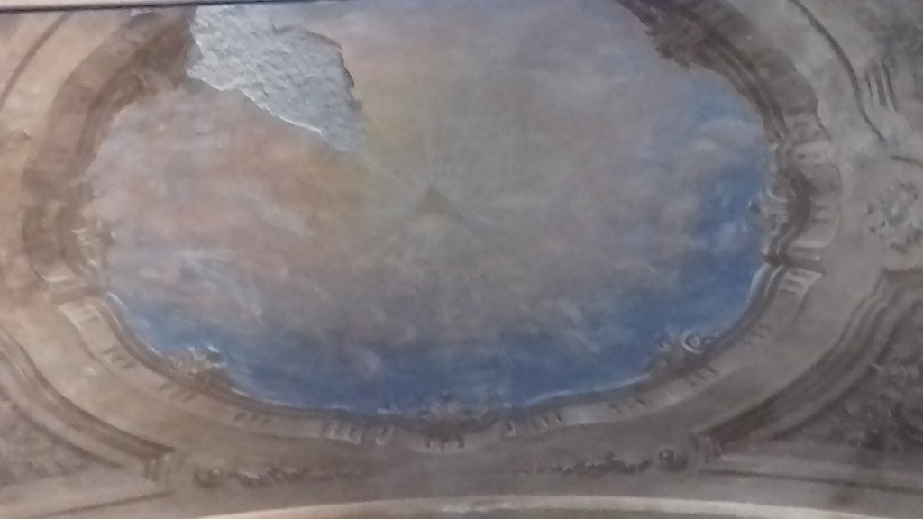 Una delle allegorie dipinte sul soffitto del salone d’entrata in cui è ben visibile il compasso (non è l’unica immagine in cui questo simbolo compare)Il simbolo presente sul soffitto della chiesa