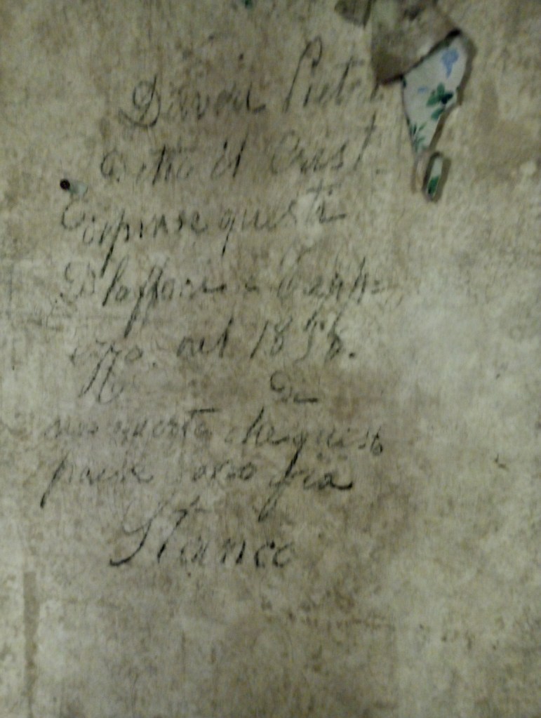 Molto emozionante è stato trovare una scritta che per secoli era stata nascosta dalla tappezzeria. Si tratta del messaggio di uno degli artigiani che aveva lavorato ai restauri della villa, lasciato probabilmente in un momento di grande stanchezza. Se la tappezzeria non si fosse scollata non avremmo mai saputo della sua esistenza. Il suo nome era Pietro Davert, e al fondo si legge “sono già stanco”
