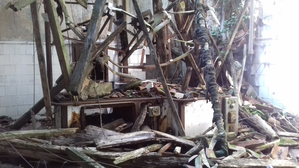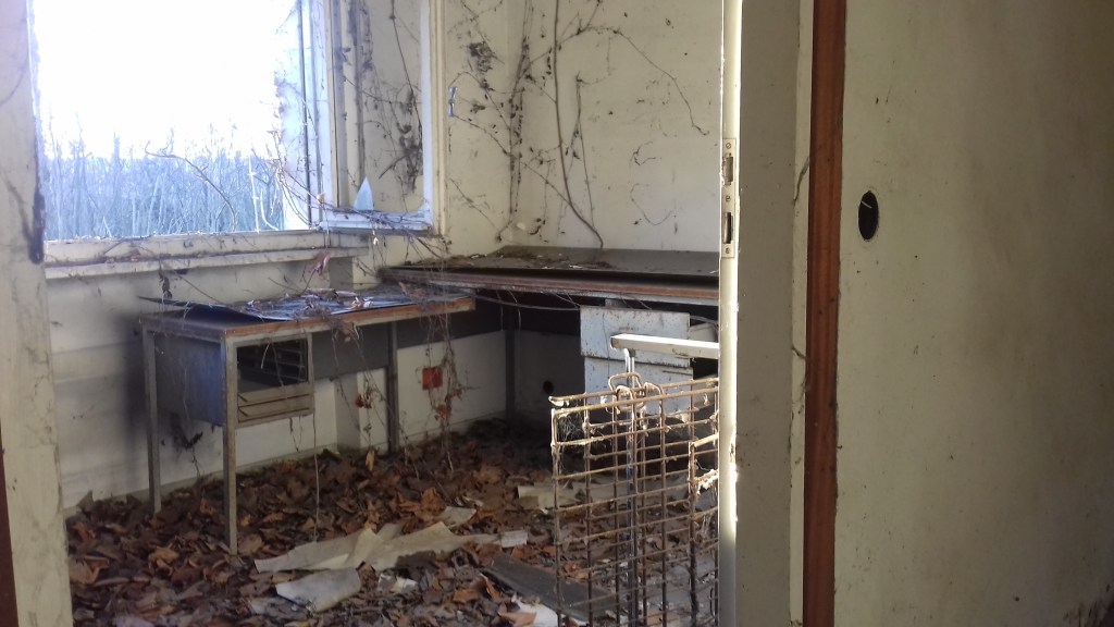 Bella la cucina al piano terra, inserita in quella che sembra una sala per la colazione. E’ proprio qui che si comprende chiaramente il motivo dell’abbandono: su una parete è presente una profondissima crepa, segno di un evidente cedimento strutturale. Forse è stato caricato eccessivamente il piano superiore, e questo ha causato il problema. Calcoli sbagliati? Superficialità? Chi può dirlo…