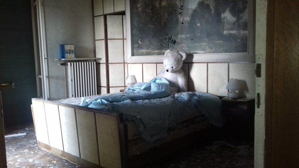 Gli orsi soprattutto abbondano nelle case abbandonate. In una villa del Biellese si trova un grande orso bianco, quasi in posa sul letto di una stanza ormai annerita dalla muffa.